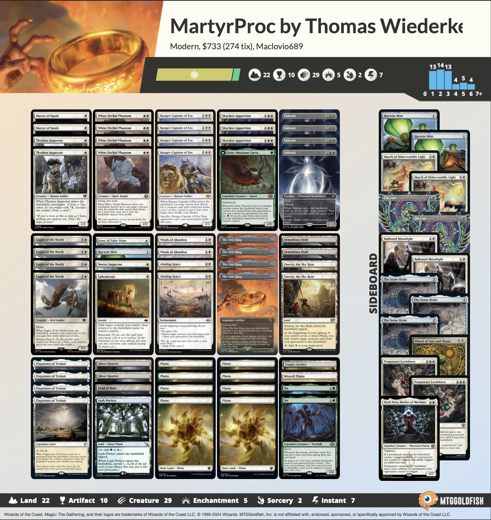 Es ist wahrscheinlich sicher zu sagen, dass The One Ring diesen fast vergessenen Archetyp zurückgebracht hat, da es dem Deck die Zeit gibt, die es braucht, um seinen Soft Lock mit Abiding Grace, Looping Martyr of Sands oder Kami of False Hope aufzubauen. Zusätzlich zu diesen One-Drops spielt Thomas zwei Thraben Inspectors und einen Novice Inspector als frühe Blocker und Kartenvorteilsmaschinen. Im Zwei-Drop-Slot sehen wir mit dem White Orchid Phantom eine neue und sehr vielversprechende Karte. Zusammen mit Demolition Field, Field of Ruin und Ghost Quarter ist das Phantom ein Alptraum für jedes Deck, das nur ein paar Basisländer spielt - was in Modern auf viele der Top-Tier-Decks zutrifft. Abgesehen davon ist das White Orchid Phantom als 2/2-Flyer mit Erstschlag für zwei Mana auch eine sehr aggressive Kreatur.