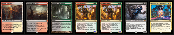 Hier sehen wir, wie Grün zum ersten Mal wichtig wird, um Kavu auf der Kurve spielen zu können. Wenn wir den Scion auf der Kurve spielen wollen, müssen wir im ersten Zug eine Triome holen, was bedeutet, dass wir im zweiten Zug entweder den Gottlosen Schrein oder die Heilige Gießerei holen müssen. Ich tendiere dazu, den Scion später zu spielen, um ihn vor Edikt-Effekten zu schützen und um nicht in Runde eins eine Triome holen zu müssen. Denke daran, dass du mit dem Godless Shrine den Kavu nicht wirken kannst. Angenommen, wir haben mit Bloodcrypt angefangen, dann brauchen wir Temple Garden als zweites Land, um unsere vier Hauptfarben zu haben, wenn wir Kavu spielen. Mit Sacred Foundry im ersten Zug werden wir stattdessen ein Overgrown Tomb im zweiten Zug spielen. Ich gebe den anderen drei möglichen Spielzügen (Bowmasters, Ragavan, Ein-Mana-Zauber) weniger Gewicht, da ihre Mana-Anforderungen ohnehin oft erfüllt sind.