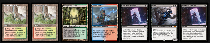 Um die Sammlung von Schockländern abzurunden, fügen wir ein Steam Vents hinzu, da es eine ungetappte blaue Quelle für unsere blauen Sideboard-Karten enthält, rot als eine von Kavus Farben und auch, weil es mit Bloodstained Mire und Wooded Foothills fetchbar ist, die zwei unserer Haupt-Fetchländer sein werden.