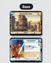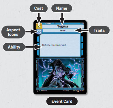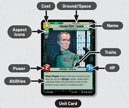 You start the game with a Base and a Leader in play. These determine which Aspects are allowed in your deck. Aspects of your cards that are not depicted on your Leader or your Base cost an additional 2 resources to play. Bases and Leaders have abilities (Actions) that can be performed during your turn, or Epic Actions, which can only be performed once per game. The Epic Action of your Leader usually involves bringing your Leader into play as a Unit to join the fight.