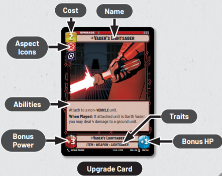 Upgrades are played on Units and enhance their strength and health. Additionally, they grant Units additional abilities.